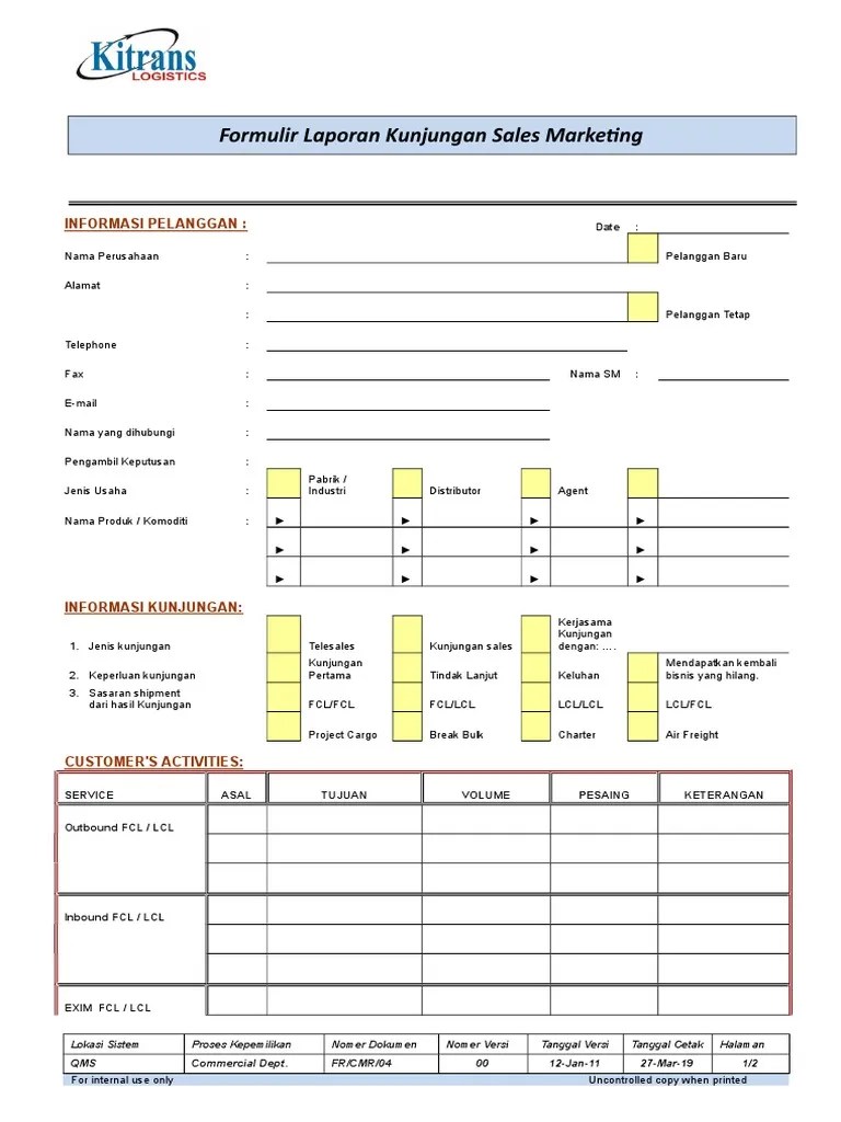 Contoh Format Laporan Marketing - Fr Cmr 04 Formulir Laporan Kunjungan Sales Marketing Pdf